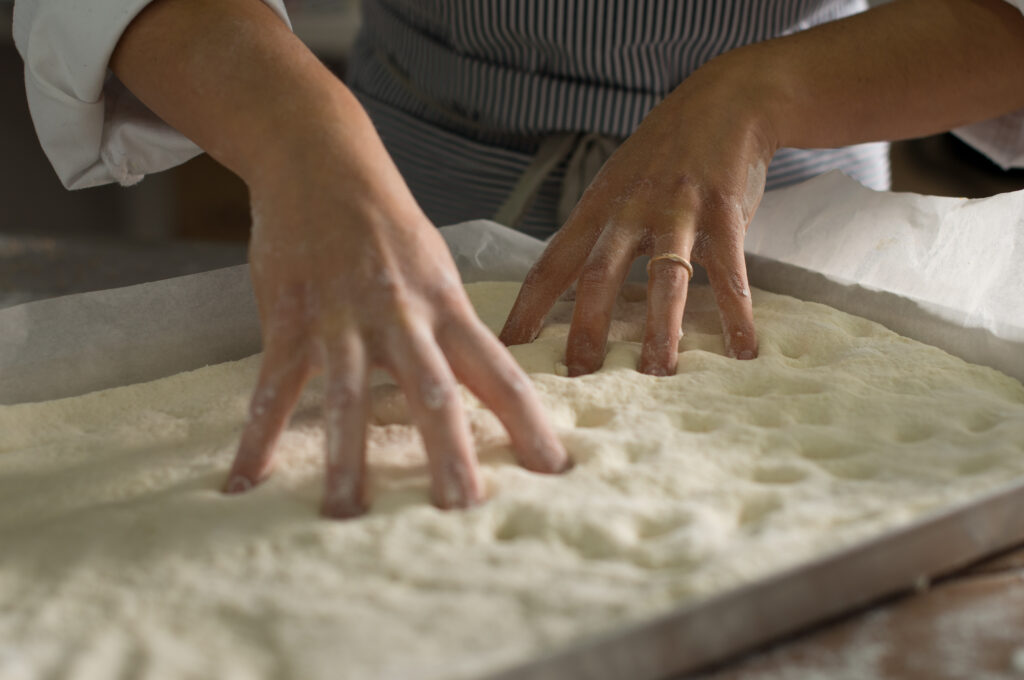 Passato il tempo della seconda lievitazione, ungiti bene le dita e affondale nell’impasto per fare i buchi tipici della focaccia ligure. Abbonda con l’olio per condire la superficie e aggiungi un pizzico di sale.